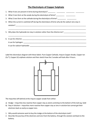 Quantitative electrolysis of aqueous copperII sulfate worksheet. Electrolysis for KS4 Chemistry - Worksheet Answers 1. Hydrogen ions and sulphate ions remain in the solution.