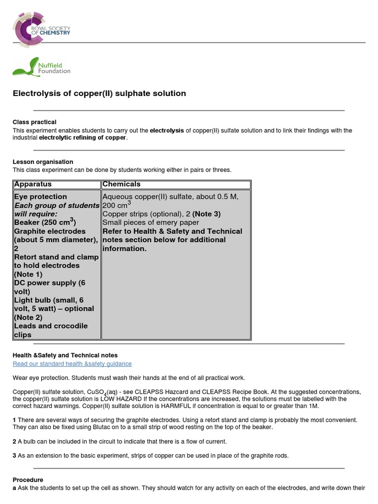Electrolysis Of Copper Sulphate Prac Sheet Teaching Resources